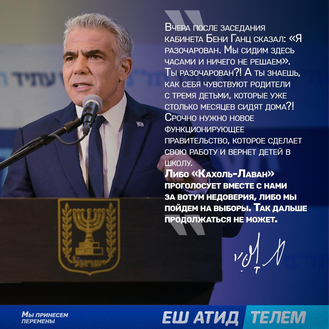 Либо «Кахоль-Лаван» проголосует вместе с нами за вотум недоверия, либо мы пойдем на выборы. Так дальше продолжаться не может.